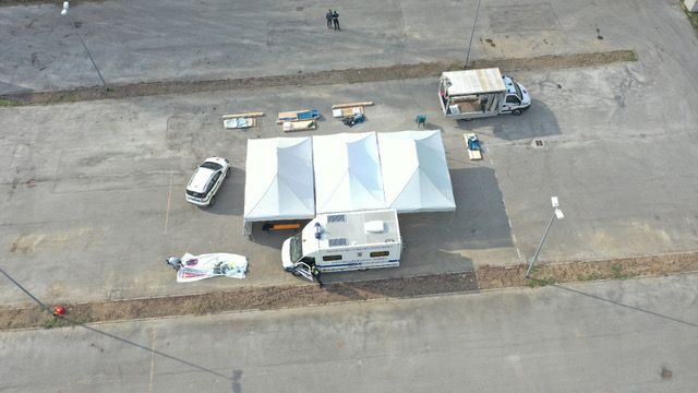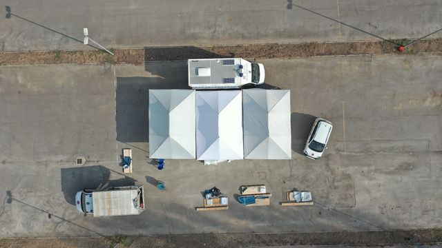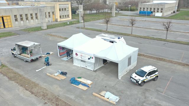 E’ stata predisposta una struttura di rapido montaggio composta da un camper, da grandi tende, e da un furgone di supporto per il trasporto del materiale, con collegamenti Internet ed autonomia elettrica, nella quale si può eseguire la vaccinazione nel pieno rispetto delle distanze.
