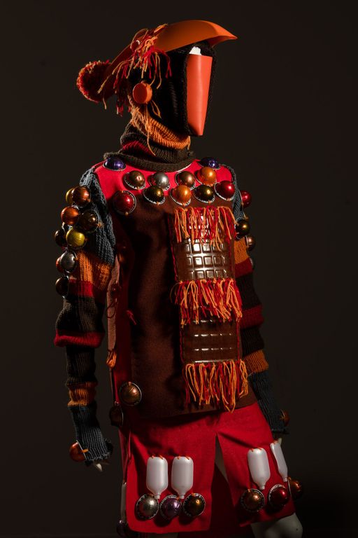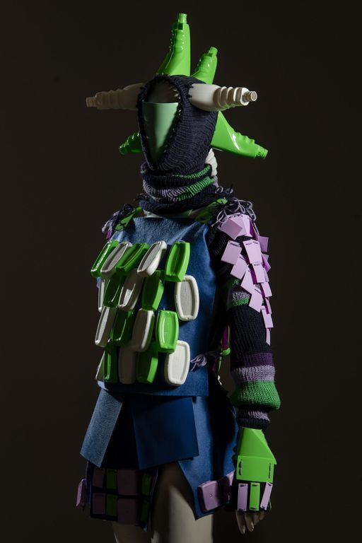 Compaiono inoltre due “corazze” che fanno dialogare materiali dissonanti come lane grezze con plastiche dei contenitori dei detergenti di uso quotidiano. Le due armature simulano la protezione di donne guerriere, facendo emergere citazioni da Hans Ruedi Giger ma anche il panno della mantella di cappuccetto rosso, gli abiti di Pierre Cardin degli anni Sessanta e i film di Mad Max.