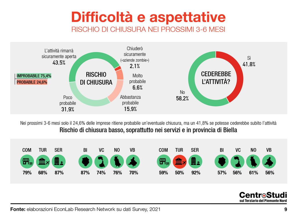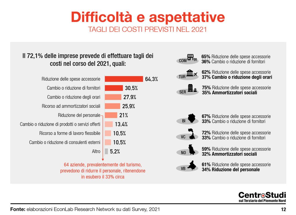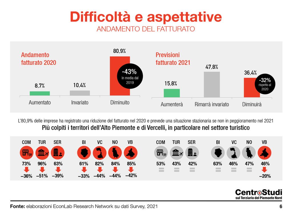 Gli impatti della pandemia sul sistema Terziario del Piemonte Nord sembrano considerevoli. Ben l’80.9% delle imprese ha registrato una riduzione del fatturato nel corso del 2020, con una perdita media del -43% rispetto ai valori riscontrati nel 2019, e prevede una situazione stazionaria (47.8%), se non in peggioramento (36.4%), per questo incerto 2021. Le maggiori difficoltà provengono dal settore turistico, all’interno del quale il 96% delle attività intervistate ha dichiarato un dimezzamento dei volumi di fatturato (in media del -51%) durante la pandemia. Più colpiti i territori dell’Alto Piemonte e di Vercelli, dove si evidenzia un numero superiore di imprese in difficoltà, con particolare attenzione alla provincia di Verbano Cusio Ossola, un’area a forte vocazione turistica, in cui il 46% delle attività prevede riduzioni in termini di fatturato anche nell’anno in corso.