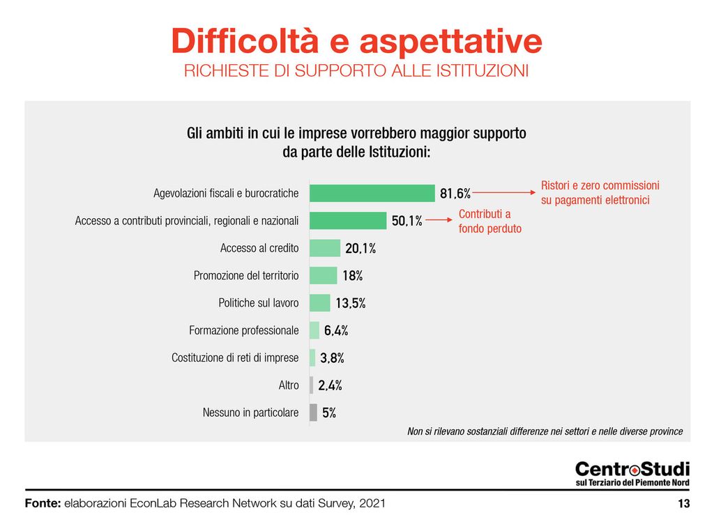 Emerge trasversalmente un problema di risorse, che evidenzia la necessità di ottenere maggiori agevolazioni fiscali e burocratiche (81.6%) per lo svolgimento della propria attività, come possono esserlo ulteriori ristori ai settori in crisi o l’annullamento delle commissioni sui pagamenti elettronici, divenuti ormai una scelta obbligata. Cresce anche la richiesta alle Istituzioni di poter accedere con più facilità ad un maggior numero di contributi a fondo perduto (50.1%) provinciali, regionali o nazionali.