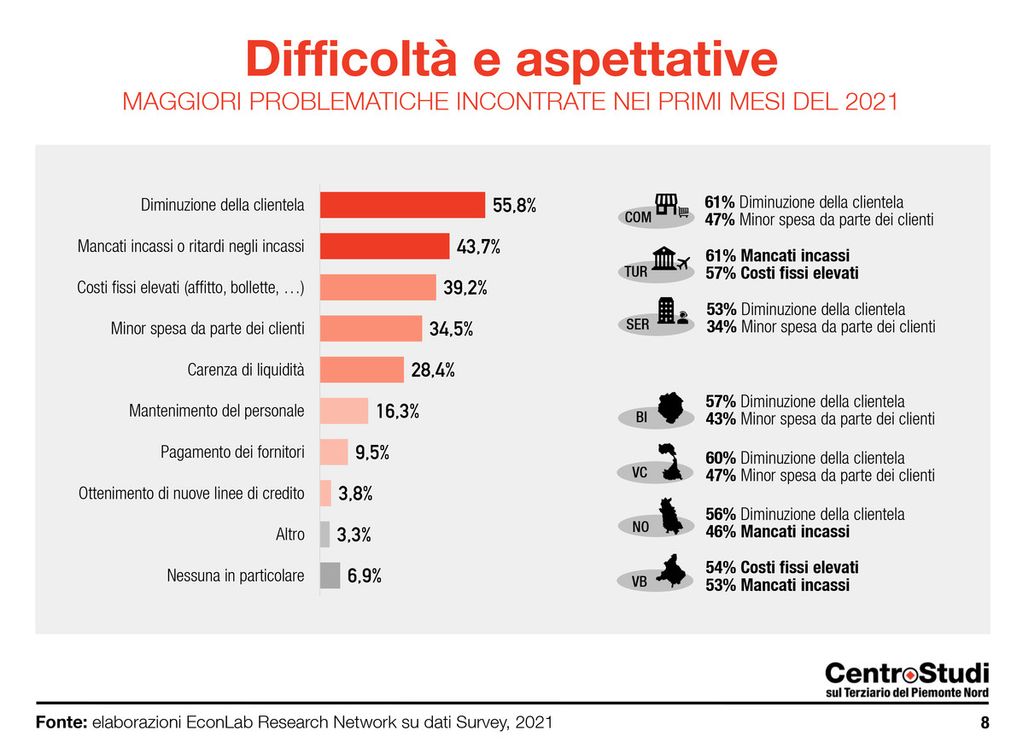 Tra le problematiche incontrate nei primi mesi del 2021, primeggiano l’evidente diminuzione della clientela (per il 55.8% delle imprese) o comunque la minor spesa sostenuta (34.5%) e i mancati incassi o il ritardo negli stessi (43.7%). Difficoltà, quest’ultima, riscontrata da ben il 61% delle realtà turistiche, per le quali i costi fissi elevati (57%), come gli affitti e le bollette, costituiscono un’ulteriore preoccupazione. Solo il 6.9% delle attività terziarie non ha rilevato particolari problematiche.