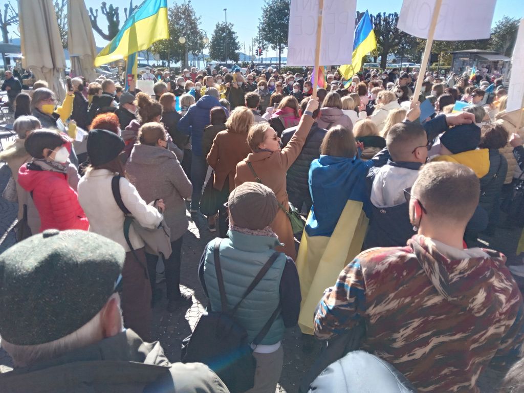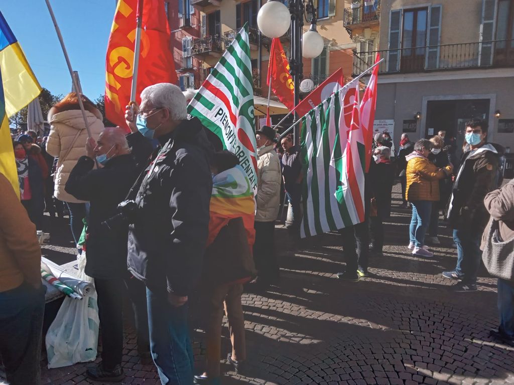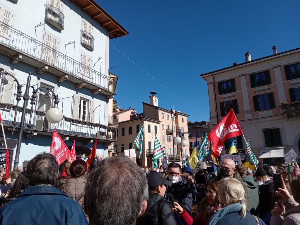 Piazza Ranzoni gremita, questa mattina, per protestare contro la guerra. Almeno 3-400 persone arrivate da tutta la provincia per dire n all’invasione di Putin. Tutta la sinistra del Verbano Cusio Ossola, sindacati ed associazioni operanti nel socio assistenziale rappresentati in piazza.