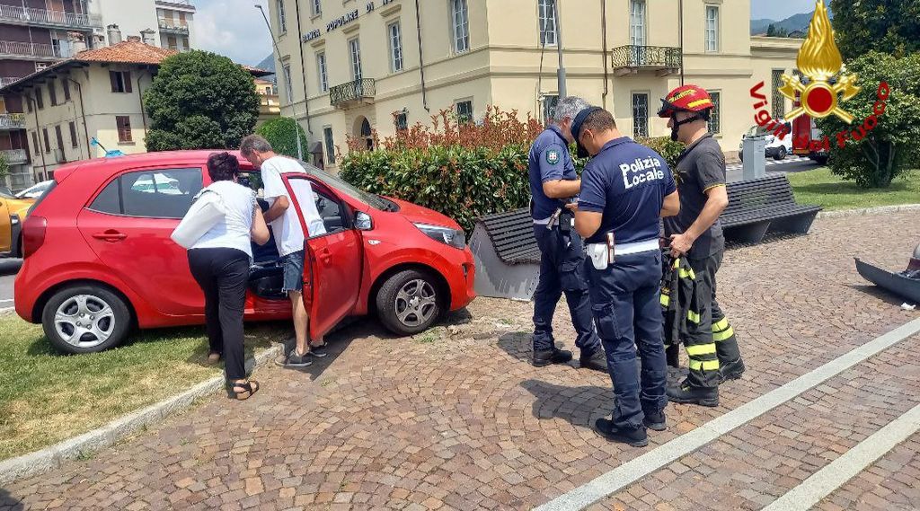 L'auto ha urtato contro una panchina e un cestino destinato alla raccolta dei rifiuti causando lievi danni. Nessuna persona coinvolta nell'incidente a parte il conducente, che è stato trasportato in ospedale dal 118 per accertamenti. Sul posto la polizia locale di Verbania per determinare le cause del sinistro e per gestire la circolazione che è rimasta regolare.