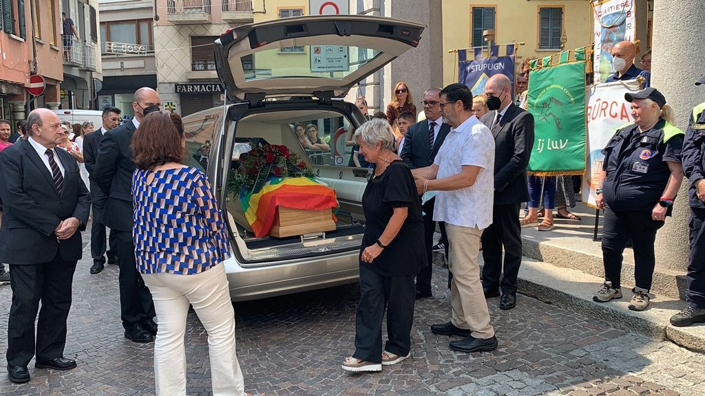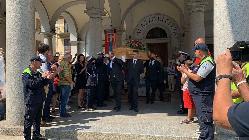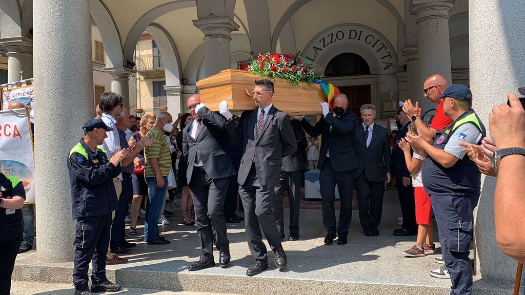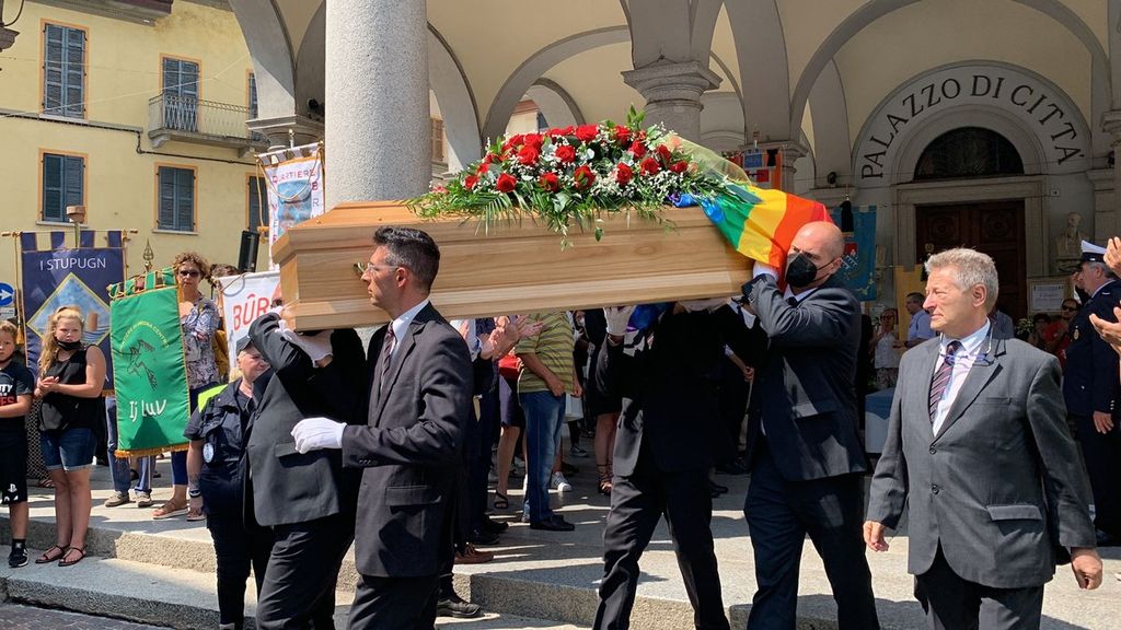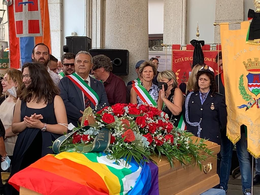 Commozione ad Omegna per l'ultimo saluto ad Alberto Soressi. I portici di quello che avrebbe dovuto essere il 'suo' nuovo ufficio, il Municipio, hanno ospitato la cerimonia funebre.