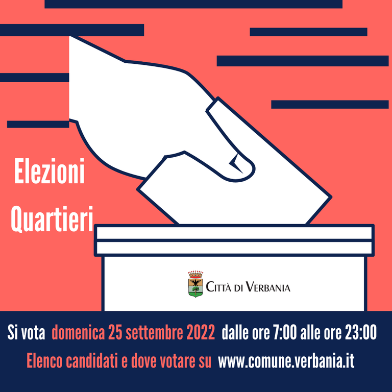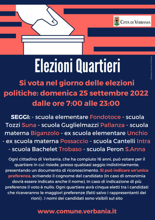 Si voterà a Verbania per il rinnovo dei Quartieri di Intra, Pallanza Sant’Anna , Verbania Est, Verbania Nord e Verbania Ovest, nel giorno delle elezioni politiche il 25 settembre 2022 dalle ore 7:00 alle 23:00 indistintamente presso uno dei seguenti seggi: