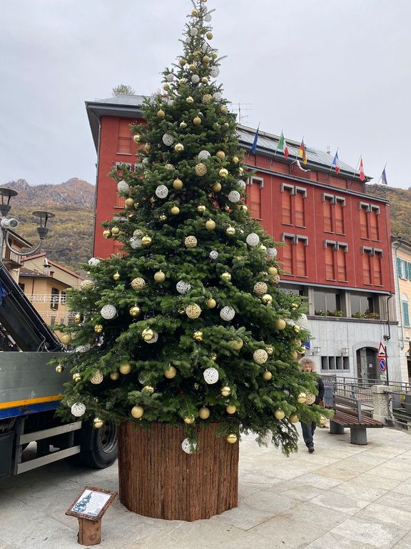 Il clima di questa mattina, con cielo nuvoloso, temperatura fredda e la neve sulle montagne, contribuisce a creare una bella atmosfera natalizia. Che a Omegna si respira grazie anche al posizionamento degli alberi di Natale: il più grosso, di circa cinque metri, è stato posizionato in di fronte al municipio, fronte lago.