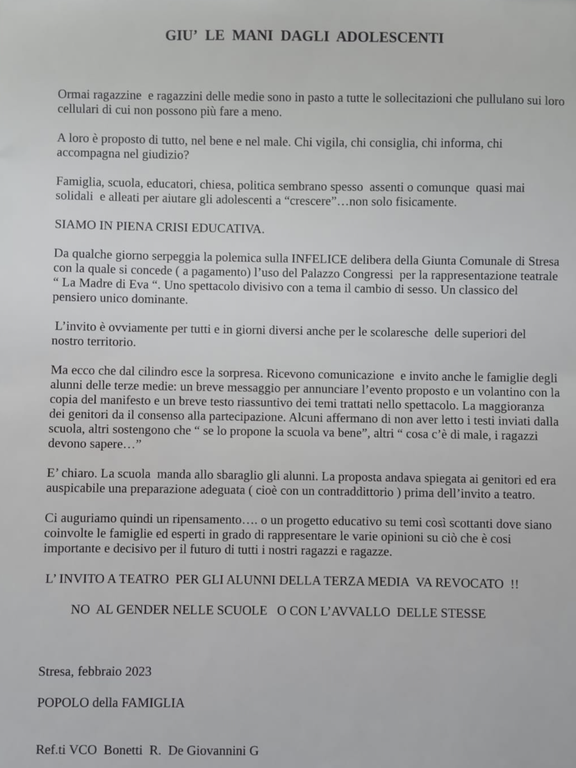 Sorpresa, ieri all’uscita dalle medie 'Clemente Rebora', ha suscitato il consigliere di maggioranza Giuseppe De Giovannini che distribuiva un volantino ai genitori in attesa dei figli in cui li si invitava a revocare il permesso ai ragazzi di terza media ad assistere allo spettacolo “La madre di Eva”, in scena oggi al Palacongressi. Spettacolo in cui la protagonista, Stefania Rocca, interpreta la mamma di un ragazzo che vuol cambiare sesso.