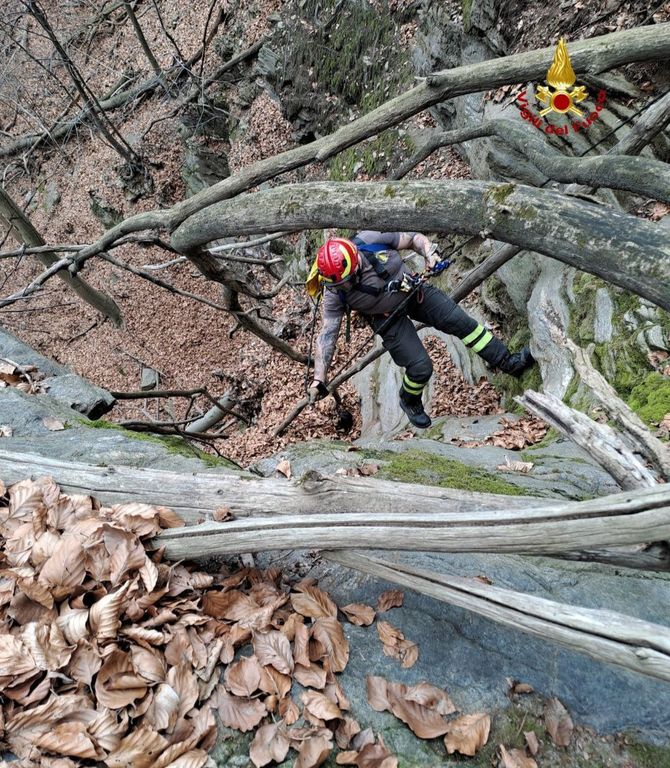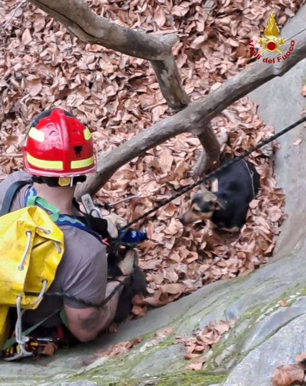 Soccorso dei vigili del fuoco a un cane caduto in un canalone sulle alture di Stresa