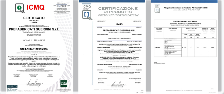 Sul fronte interno l’Azienda ha ottenuto, dopo le più importanti Certificazioni di qualità nel settore delle costruzioni, anche la prestigiosa Certificazione di Gestione Ambientale ISO 14001 e la Certificazione sul contenuto di materiale riciclato ISO 14021, che testimoniano il suo percorso virtuoso nel campo dell’eco-sostenibilità, con attenzione all’acquisto di materie prime (inerti, cemento ecc..), volto a ridurre l’impatto sul consumo di tali fonti primarie.