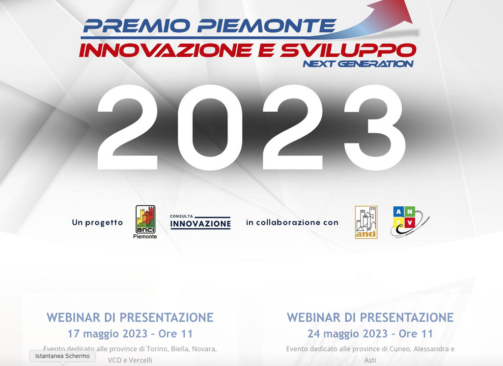 Mercoledì 17 maggio, dalle ore 11, si terrà il primo Webinar formativo dedicato a Comuni ed Enti Locali per il lancio del Premio Piemonte Innovazione e Sviluppo Next Generation 2023, organizzato da Anci Piemonte con la collaborazione di ANFoV. Durata dell’evento circa 90 minuti.