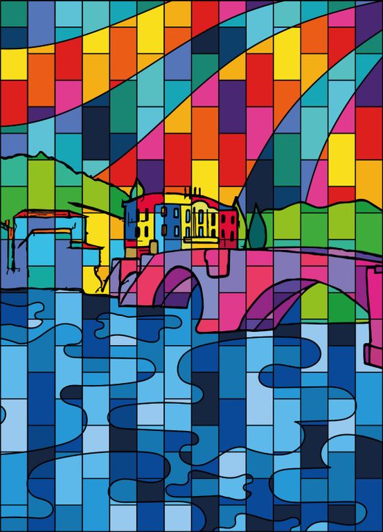 L'opera, caratterizzata dallo stile unico e riconoscibile dell'autore, rappresenta il ponte San Giovanni nel suo stato originario, prima del crollo avvenuto trent'anni fa, con le due arcate ancora intatte e senza la passerella in legno.
