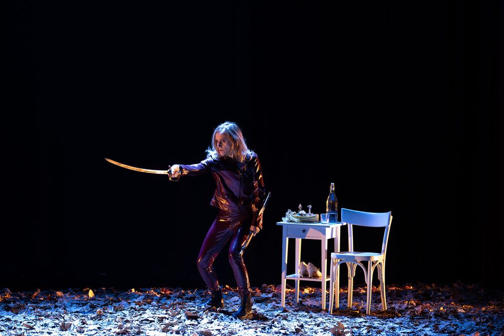 Il linguaggio scelto unisce più discipline: il teatro di parola, la danza, la musica e il teatro d’object. Molto forte è l’elemento figurativo, caratterizzato dalla presenza di un pavimento ricoperto di foglie secche che accompagnano fisicamente ogni azione e diventano metafora del rinnovamento: la donna si disegna gli spazi del proprio labirinto, in una sorta di Dogville d’appartamento che muta con il racconto di sé, capace di segnare conquiste e perdite.