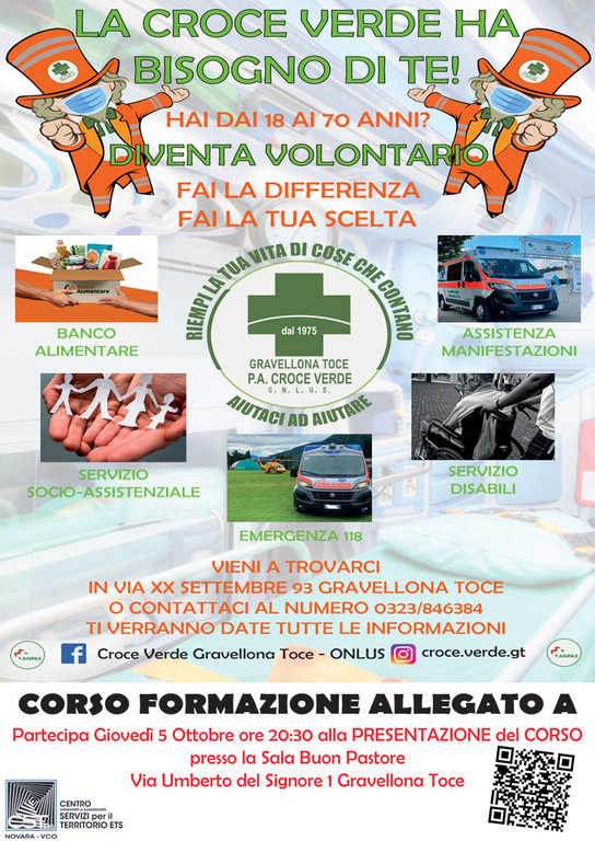 La Croce Verde di Gravellona Toce cerca nuovi volontari per svolgere il crescente numero di servizi a favore della popolazione e organizza un nuovo corso gratuito per diventare soccorritrici e soccorritori. Il corso è aperto a tutti i cittadini maggiorenni e verrà presentato giovedì 5 ottobre, alle ore 20.30 presso la sala Buon Pastore di Gravellona Toce, in via Umberto del Signore,1