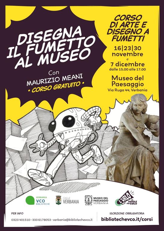 Dal 16 novembre, invece, presso la sede di Palazzo Viani Dugnani prenderà il via il corso per adolescenti (dai 12 ai 18 anni) “Disegna il fumetto al museo” con Maurizio Meani. Il corso è gratuito e organizzato in collaborazione con la Biblioteca Civica nell’ambito del progetto “L’Urlo. Le parole per dirlo” finanziato dalla Compagnia di San Paolo. Quattro lezioni. il giovedì pomeriggio (16, 23, 30 novembre e 7 dicembre), dalle 15.00 alle 17.00. L’iscrizione è obbligatoria sul sito https://www.bibliotechevco.it/corsi. Durante il primo incontro, dopo una visita guidata al Museo del Paesaggio, sarà chiesto ai ragazzi di identificare l'opera che più li incuriosisce, che poi verrà reinterpretata in chiave fumettistica. Negli altri tre incontri, con la collaborazione del disegnatore di fumetti professionista Maurizio Meani, un quadro o una statua saranno trasformati, dando vita ad una storia di pura fantasia che vedrà la luce in una serie di tavole e fumetti. Le tavole realizzate potranno essere protagoniste di un'esposizione dedicata all'interno del Museo. Tutti i materiali saranno forniti, durante gli incontri, in uso gratuitamente.