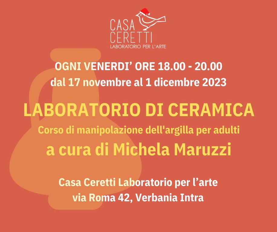 E ancora un corso di ceramica per adulti con Michela Maruzzi il venerdì sera dalle 18.00 alle 20.00, sempre nella sede di Casa Ceretti, dal 17 novembre al 1° dicembre. Il corso illustrerà le principali tecniche di lavorazione dell’argilla, verranno realizzati alcuni oggetti, in seguito cotti in apposito forno ceramico e sarà anche un’ottima occasione per rilassarsi grazie alla piacevole sensazione che regala la manipolazione dell'argilla. Prenotazione obbligatoria chiamando il numero 347-4218512 (massimo 6 iscritti). Prezzo per l’intero corso (3 lezioni): 75€ materiale incluso.