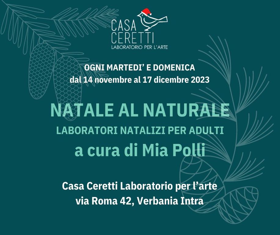 A Casa Ceretti anche alcuni corsi dedicati agli adulti. Innanzitutto, il laboratorio “Natale al naturale”, curato da Mia Polli, per creare con materiali naturali e di riciclo delle decorazioni natalizie uniche e sostenibili. Il corso è in programma dal 14 novembre al 17 dicembre, il martedì mattina (dalle 10.00 alle 12.00) e la domenica pomeriggio (dalle 16.30 alle 18.30). Per info e inscrizioni scrivere a miapolli@tiscali.it. Il prezzo a singolo laboratorio è di 20€, materiale incluso. È possibile iscriversi a tutto il corso (5 incontri il martedì oppure la domenica a un prezzo speciale di 80€).