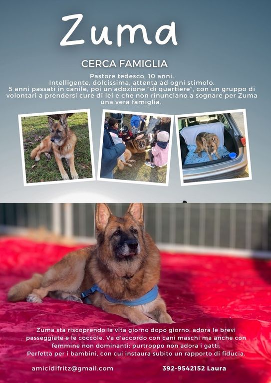 Intanto, dopo l'abbandono, 5 anni di canile e un anno esatto come cane di quartiere, Zuma avrà una festa in suo onore. L'associazione "Amici di Fritz" invita tutti, sabato 18 novembre, alle ore 15.00, di fianco al municipio (Via Guglielmo Marconi, 247) a festeggiare il "compleanno" di Zuma.