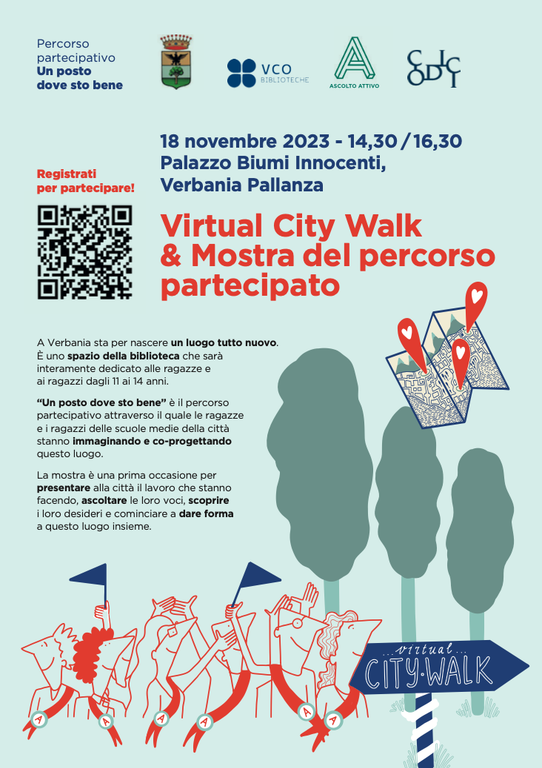 L’immaginazione dei ragazzi e delle ragazze ha poi trovato forma grazie al lavoro di un’esperta in facilitazione visuale, Marielle Binken, che ha realizzato pannelli illustrati e altri materiali utili a comunicare i pensieri dei ragazzi. Tutti questi lavori, accompagnati dalle fotografie realizzate durante i laboratori, saranno esposti sabato 18 novembre dalle 14.30 a Palazzo Biumi, in occasione dell’iniziativa “Virtual City Walk e mostra del percorso partecipativo”. Sarà la prima occasione per conoscere quali sono i luoghi di Verbania preferiti da chi ha 11-14 anni e come immaginano i luoghi dove stare bene.