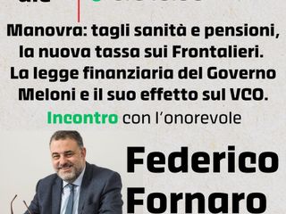 Tagli alla sanità e alle pensioni, la nuova tassa sui frontalieri, la legge finanziaria del governo Meloni e il suo effetto sul Vco. Questi e molti altri gli argomenti saranno trattati durante l’incontro pubblico con l’onorevole Federico Fornaro. L’appuntamento è per sabato 2 dicembre, alle ore 10.00 a Palazzo Flaim a Verbania Intra.