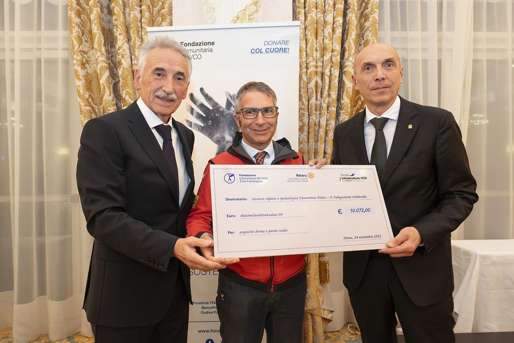 Il presidente della Fondazione, unitamente al presidente del Rotary Club Pallanza Stresa Paolo Lerede, ha quindi consegnato al responsabile dalla Delegazione Valdossola del Soccorso Alpino Matteo Gasparini un contributo di 10.000 euro (6 mila donati dal Rotary) per l’acquisto di un drone e di un ponte radio mobile.