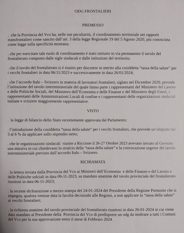 Venerdì 26 gennaio durante al Tavolo del Frontalierato provinciale si è parlato della tassa della salute che tanto sta facendo discutere in questi giorni. Il presidente della Provincia Alessandro Lana, aveva annunciato la predisposizione di un ordine del giorno da inviare a tutti i 74 comuni del Vco e da votare in ogni consiglio comunale, per poi inoltrare al Governo una richiesta di stralcio della nuova tassa sulla sanità imposta ai frontalieri.