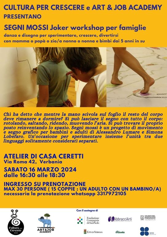 A seguire, dalle 16.30 alle 17.30, a Casa Ceretti a Intra “Segni Mossi”, un workshop per famiglie con danza e disegno per sperimentare, crescere e divertirsi insieme. L’iniziativa è rivolta ai bambini dai 5 anni in su, con un massimo di 30 partecipanti (15 coppie adulto+bambino), ed è promossa da Cultura per Crescere e Art & Job Academy. È necessaria la prenotazione tramite WhatsApp al numero 331 7972105.