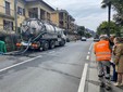 Lavori in corso oggi in via Novara a Omegna, all'altezza del numero civico 17. Operai impegnati a disotturare la condotta delle acque superficiali intasata da vari rifiuti, tra cui recipienti, bidoni e canne dell'acqua usate per l'irrigazione di orti e giardini.