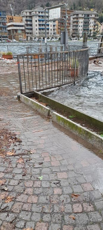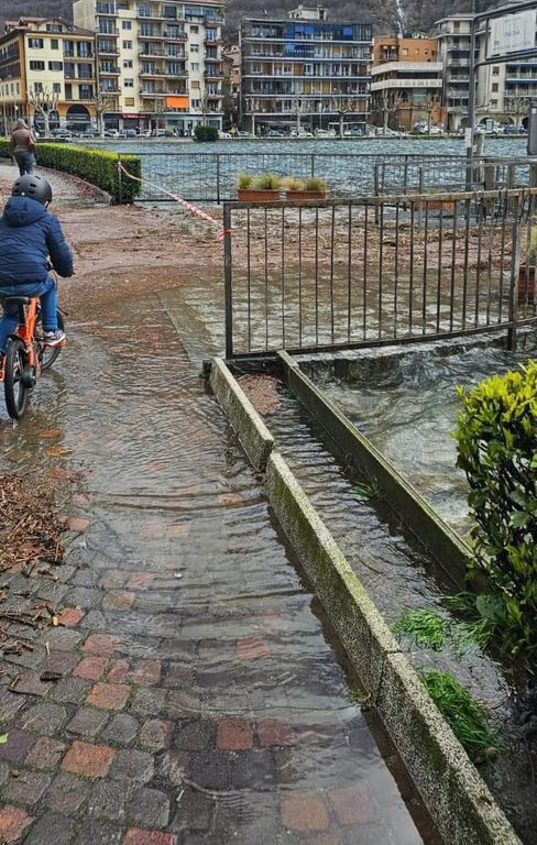 Vicinissimo all'esondazione ai giardini pubblici di Omegna il lago d'Orta, anche a causa delle onde causate dal vento.