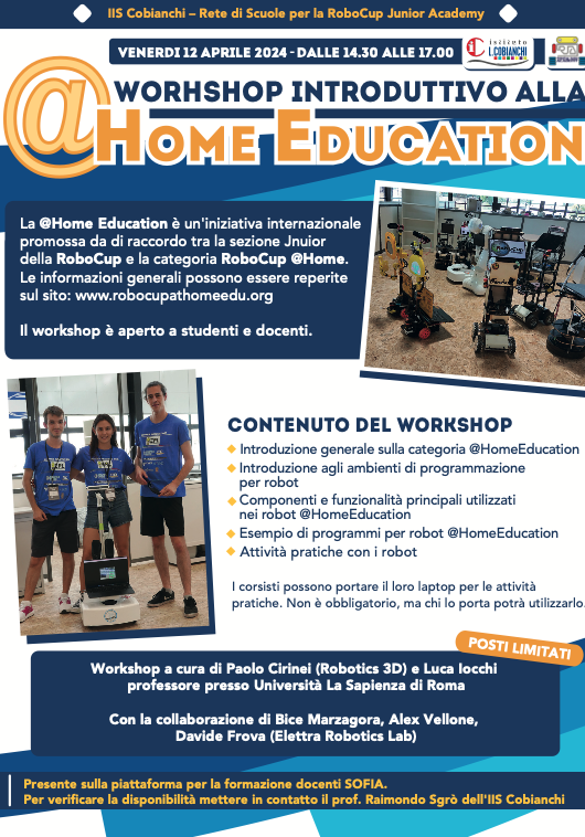 Durante la manifestazione, oltre alle categorie di gara della sezione Junior, si svolgeranno anche degli eventi collaterali. In particolare, nella mattinata del 12 aprile, il convegno “Robotica ed Intelligenza Artificiale per a Scuola”. Nel pomeriggio dello stesso giorno, poi, il workshop sulla categoria @Home Education, una specialità preparatoria della lega maggiore @Home, che vede robot muoversi in ambiente domestico. Nella mattinata del 13 aprile al Palazzetto si svolgerà una dimostrazione della Humanoid Entry, si tratta di una specialità sperimentale propedeutica alla lega maggiore con robot umanoidi di taglia inferiore ai 60cm.
