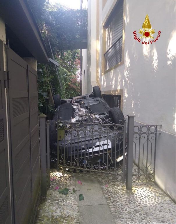 Per cause in via di accertamento una vettura è caduta da una piazzola ribaltandosi e incastrandosi tra un muro di contenimento e le pareti esterne di un'abitazione.