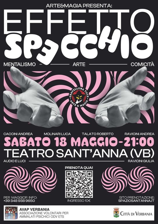 Il 18 maggio, al Teatro Sant'Anna, sarà la volta dello spettacolo di Arte&Magia "Effetto specchio", un mix di mentalismo, arte e comicità. L'ingresso è di 10 euro e i biglietti sono disponibili sul sito www.spaziosantanna.it.