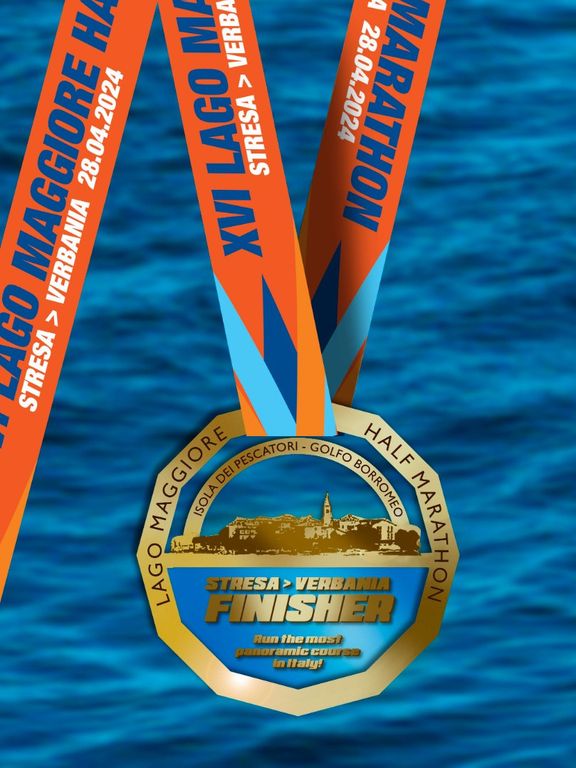 Impareggiabili le emozioni del traguardo alle quali si aggiungono quelle della medaglia finisher, un oggetto di metallo dorato dodecagonale nel quale è inciso il profilo dell’Isola dei Pescatori che poggia sulle acque del Lago Maggiore. Il nome dell’evento è riportato su un secondo intaglio impreziosito da una decorazione con degli angoli che conferiscono un effetto cornice e trasformano la medaglia in un vero e proprio piccolo quadro. Toni di arancio per il nastro decorativo che riporta nome e data della manifestazione.