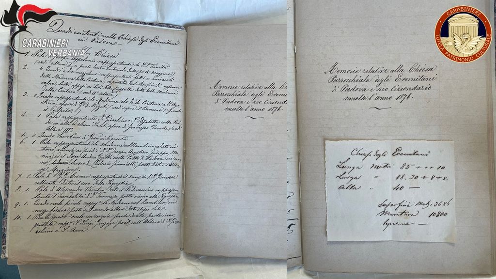 Nella prima metà del decorso 2022 i Carabinieri del Nucleo Tutela Patrimonio Culturale di Bologna, nell’ambito di un’indagine che aveva portato alla denuncia di un soggetto emiliano per ricettazione di beni culturali, avevano proceduto al sequestro di alcuni documenti archivistici di interesse storico, tra cui un manoscritto denominato “Memorie relative alla Chiesa parrocchiale degli Eremitani di Padova e suo circondario raccolte l’anno 1876”.