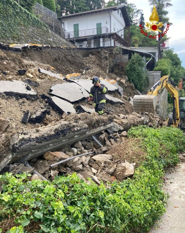 I vigili del fuoco di Verbania e i vigili del fuoco volontari del distaccamento di Stresa sono stati impegnati per il cedimento parziale di un tratto di strada privata che si dirama da via Sempione a Baveno.