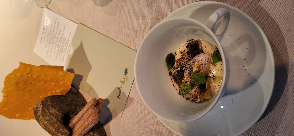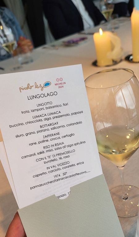 Marco Sacco, lo chef due stelle Michelin, per i 50 anni di attività del Piccolo Lago, il suo ristorante poggiato sulle acque del lago di Mergozzo, esprime tutta la sua creatività e l'amore per la sua terra con il menu "Lungolago". Un viaggio sensoriale ed emozionale dove ogni piatto diventa arte, dove i prodotti degli artigiani del gusto locali vengono esalatati con accostamenti studiati, ricercati, sorprendenti.