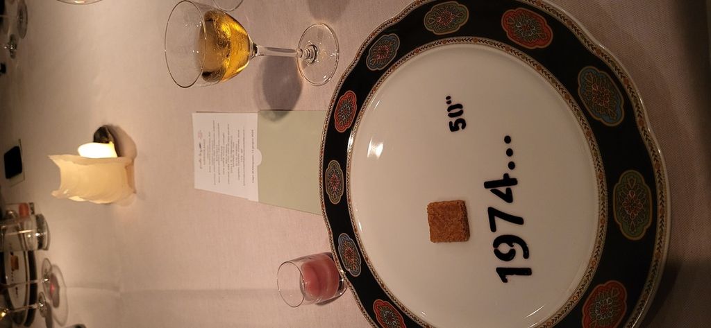 Il dolce per il 50° del Piccolo Lago poi, nella sua semplicità geniale, è l'apoteosi di questo viaggio: un biscotto "Fugascina", dolce tipico del lago di Mergozzo, con cui "raccogliere" il mirtillo che compone la scritta per l'anniversario del ristorante e seguito poi da un tripudio di altri dolci che chiudono il menu portando all'estasi totale i commensali.