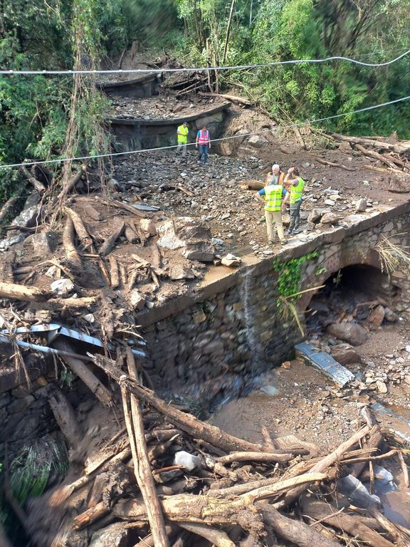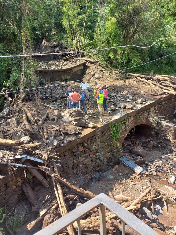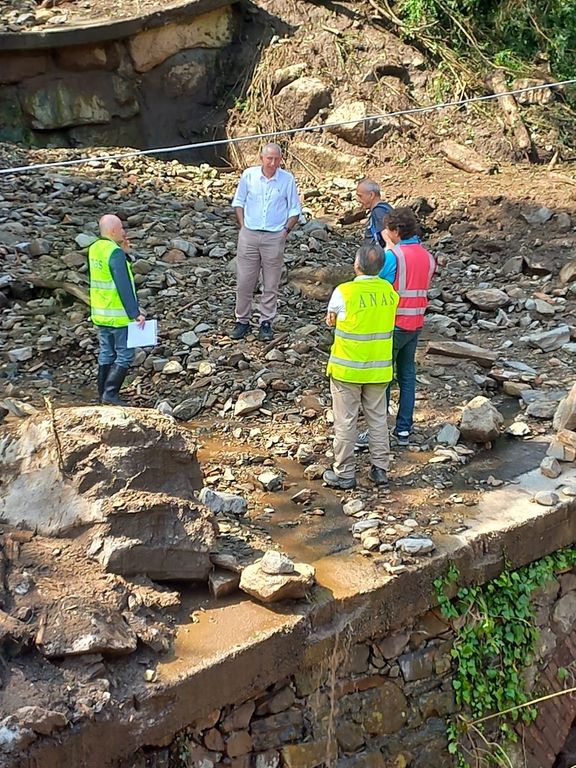 Primo sopralluogo tecnico sul luogo della frana di Traffiume che ha ostruito in entrambe le direzioni di marcia la statale 631 della Valle Cannobina. Questa mattina sono saliti sul luogo dello smottamento il sindaco Gianmaria Minazzi, il geologo del comune dottor Paolo Millemaci e i tecnici Anas per un primo esame della situazione.