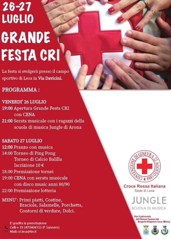 La Croce Rossa di Lesa è pronta a dare il via alla sua “Grande Festa Cri”, un evento che si svolgerà questo fine settimana, venerdì 26 e sabato 27 luglio, presso l’area attrezzata del campo sportivo. La manifestazione promette due giorni ricchi di intrattenimento, musica e ottimo cibo.
