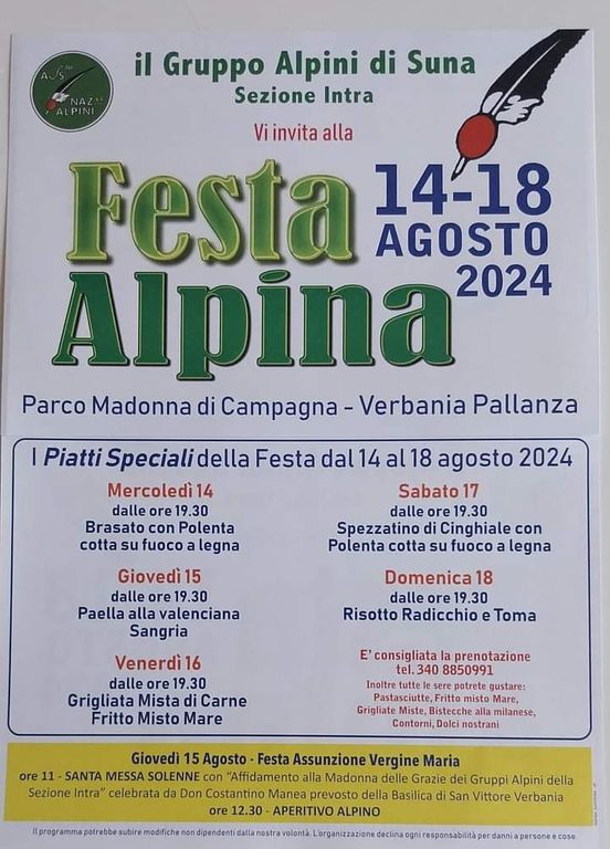 Lo stand gastronomico apre alle 19.30 di mercoledì 14 agosto: piatto del giorno brasato con polenta cotta su fuoco a legna. A Ferragosto la comunità parrocchiale festeggia l’Assunzione della Vergine Maria: messa solenne con “Affidamento alla Madonna delle Grazie dei Gruppi alpini associati alla sezione Ana Verbano di Intra”. Alle 19.30 paella alla valenciana e sangria. Venerdì 16 grigliata mista di carne e fritto misto di mare, mentre sabato 17 spezzatino di cinghiale con polenta cotta sul fuoco a legna. Domenica 18, infine, risotto con radicchio e toma. Le specialità dei cuochi del gruppo Alpini vengono servite a partire dalle 19.30. L’organizzazione consiglia la prenotazione al numero 340 8850991.