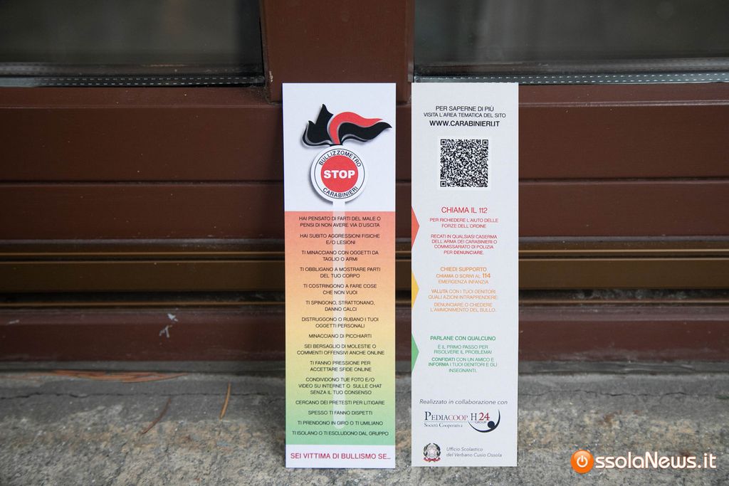 “Questi reati riguardano, in particolare, i ragazzi tra i 14 e i 18 anni”, spiega il maggiore Alberto Rondano, comandante della compagnia dei carabinieri di Domodossola. “Stiamo portando avanti una campagna di sensibilizzazione: unitamente all’ufficio scolastico del Vco, abbiamo realizzato un segnalibro che si chiama “bullizzometro”. È presente una scala di colori che va dal verde al rosso, in base alla gravità dei fatti compiuti o ricevuti. Sul retro del segnalibro, poi, c’è un qr code che indirizza al sito istituzionale dell’arma dei carabinieri, tramite il quale è possibile avere più informazioni sul fenomeno in sé e su come contrastarlo”.