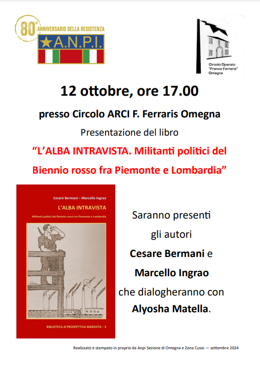 Sabato 12 ottobre, alle ore 17:00, nel salone del Circolo Operaio Arci "F. Ferraris" di Omegna, si terrà la presentazione del libro "L'alba intravista. Militanti politici nel Biennio Rosso fra Piemonte e Lombardia" di Cesare Bermani e Marcello Ingrao.