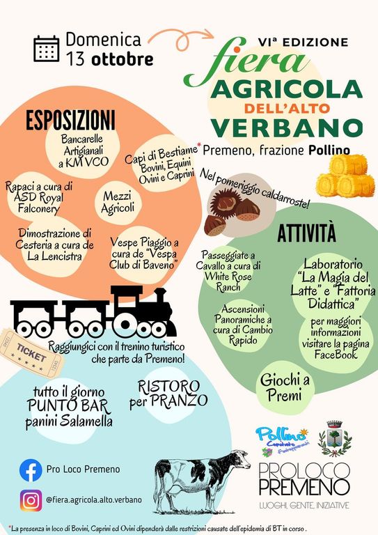 Una giornata a contatto con la natura e con gli animali, nella nella magnifica cornice della Piana, nella frazione Pollino di Premeno: domenica 13 ottobre sulle colline sopra il lago Maggiore torna la Fiera Agricola dell’Alto Verbano, giunta alla sesta edizione.