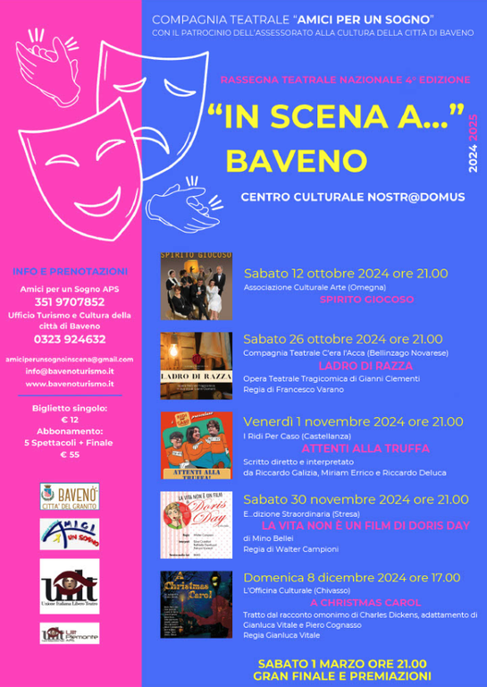 Parte oggi, 12 ottobre, la rassegna teatrale In scena a...Baveno, giunta alla sua quarta edizione, che promette di incantare il pubblico con sei spettacoli presentati da compagnie amatoriali provenienti da diverse località italiane. Questo evento, organizzato dall’Associazione culturale Amici per un sogno con il patrocinio dell'Assessorato alla Cultura della Città di Baveno, si svolgerà presso il Centro culturale Nostr@domus a Baveno e culminerà in un Gran Gala finale al Teatro S. Anna di Verbania.