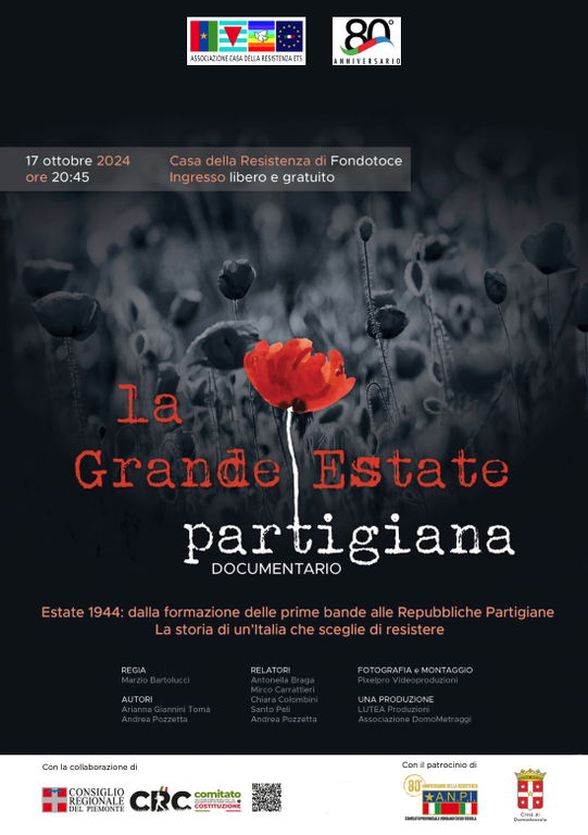 Il 17 ottobre 2024, alle ore 20.45, presso la Casa della Resistenza in Via Turati 9 a Verbania Fondotoce, si terrà la presentazione in anteprima del documentario La grande estate partigiana. Realizzato dal regista Marzio Bartolucci, in collaborazione con gli autori Arianna Giannini Tomà e Andrea Pozzetta, il progetto è frutto della produzione di Lutea e dell'Associazione DomoMetraggi, con fotografia e montaggio a cura di Pixelpro Videoproduzioni.