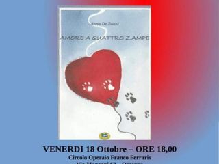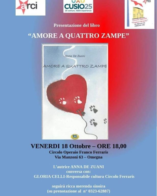 Proseguono con successo le presentazioni al Circolo Ferraris di Omegna nell’ambito del corso letterario dedicato alla Terza età. Domani, venerdì 18 ottobre, alle 18, si svolgerà un incontro speciale con Anna De Zuani, che converserà con Gloria Celli, responsabile degli eventi culturali del Circolo, sul suo libro “Amore a quattro zampe”.