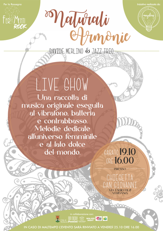Sabato 19 ottobre alle ore 16.00 Davide Merlino & Jazz trio si esibiranno sul prato antistante la chiesetta di San Giovanni in via Fabio Filzi a Verbania. Sarà un live show ove si suonerà live “Naturali armonie”, ovvero una raccolta di musica originale eseguita al vibrafono di Davide Merlino, alla batteria di Andrea Cocco ed al contrabbasso e flauto di Gabriele Artuso.