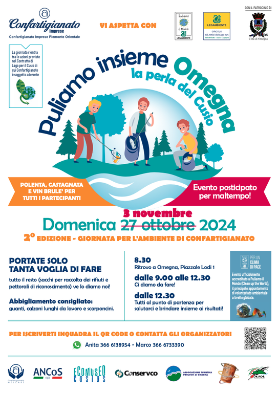 Domenica 3 novembre, a partire dalle 8.30, si svolgerà l’evento “Puliamo insieme Omegna, la perla del Cusio”, promosso da Confartigianato Imprese Piemonte Orientale insieme a Legambiente - Circolo Amici del Lago Aps, patrocinio del comune di Omegna. All’iniziativa partecipano Ancos, Ecomuseo Cusius, ConserVco, associazione turistica Pro Loco di Omegna, Amici di Bagnella, Ana – Associazione Nazionale Alpini sezione Cusio Omegna.