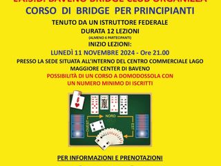 A partire da lunedì 11 novembre il Baveno Bridge Club organizza con il “Patrocinio della Città di Baveno” un corso di Bridge per principianti presso la propria sede di Baveno, all’interno del Centro Commerciale Lago Maggiore, nei pressi dello svincolo autostradale.