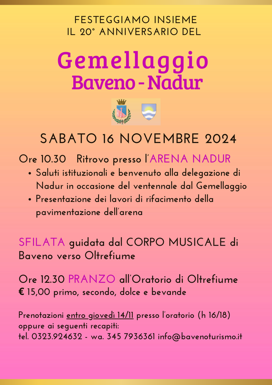 Sabato 16 novembre 2024, Baveno celebra il ventennale del gemellaggio con Nadur, una cittadina di Malta, con una giornata ricca di eventi che coinvolgeranno la comunità locale e la delegazione maltese. I festeggiamenti prenderanno il via alle 10:30 presso l’Arena Nadur, sul lungolago di Baveno, con i saluti istituzionali e il benvenuto ufficiale alla delegazione di Nadur, giunta per celebrare questa importante ricorrenza.