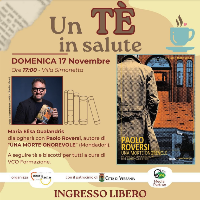 Domenica 17 novembre alle ore 17.00, l’associazione AmaRene Onlus, con il patrocinio del Comune di Verbania, organizza il secondo incontro della rassegna letteraria “Un Tè in Salute”. L’appuntamento avrà luogo a Villa Simonetta a Verbania Intra, dove Paolo Roversi, autore del romanzo giallo “Una morte onorevole” (Mondadori), dialogherà con Maria Elisa Gualandris.